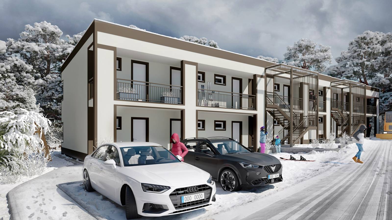Celkem 19 apartmánů s kuchyňským koutem ve dvoupodlažních domech o velikosti podlahové plochy přibližně 27,5 m2 nabízí pohodlný komfort pro vaši rekreaci a odpočinek. Žádné starosti s péčí a údržbou chaty nebo chalupy. 100 % času jen pro vás a vaši relaxaci, kdykoliv se rozhodnete.